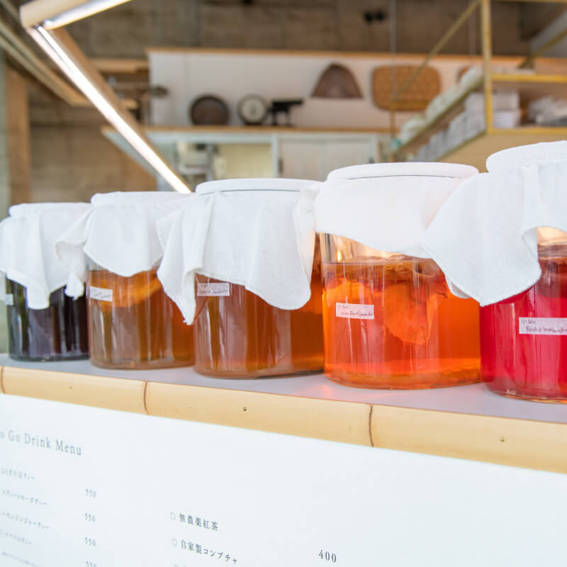 クッキー・焼き菓子やロースナック、グラノーラ、 ドリンクはオリジナル製造の花茶、コーディアル、コンブチャなども販売しております。